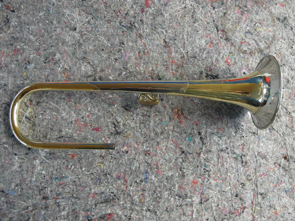 Alle Messingflicken, der Handschutz und die Plakette wurden einzeln angefertigt bzw. entbeult und auf das geglättete Schallstück neu aufgelötet.